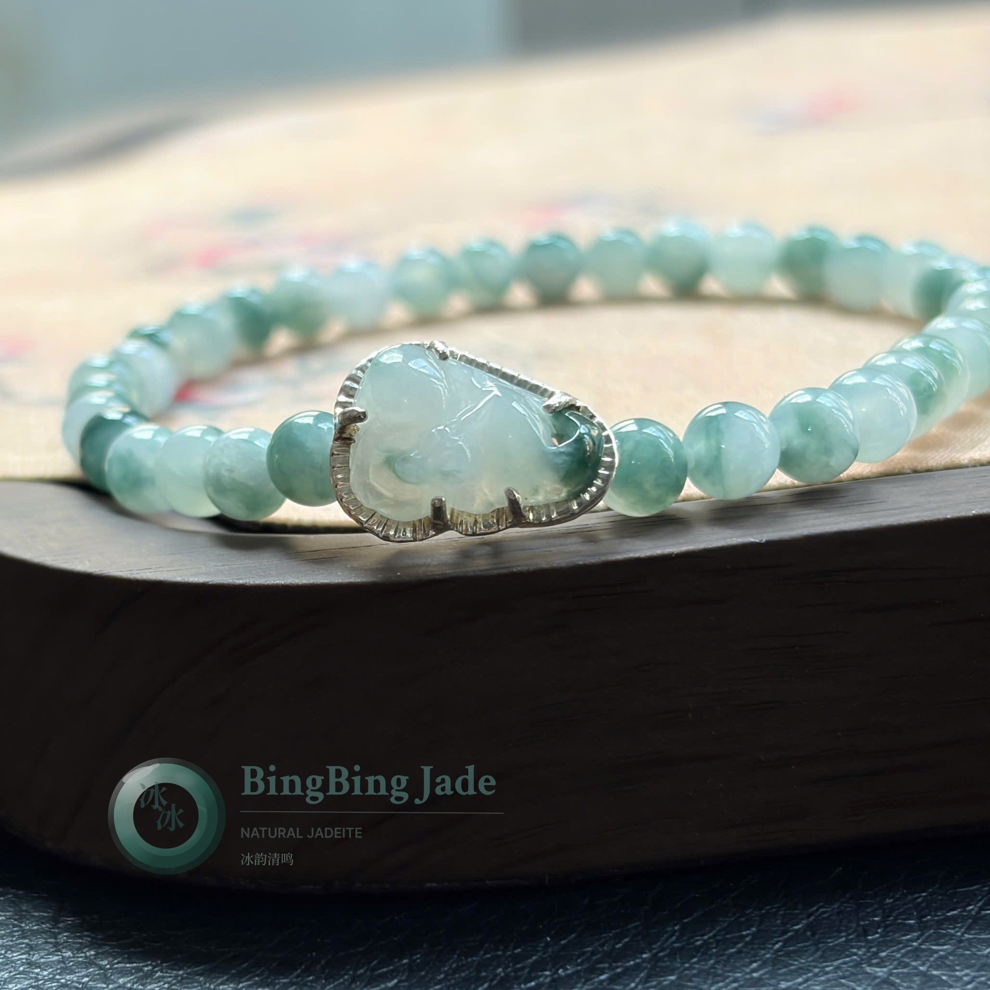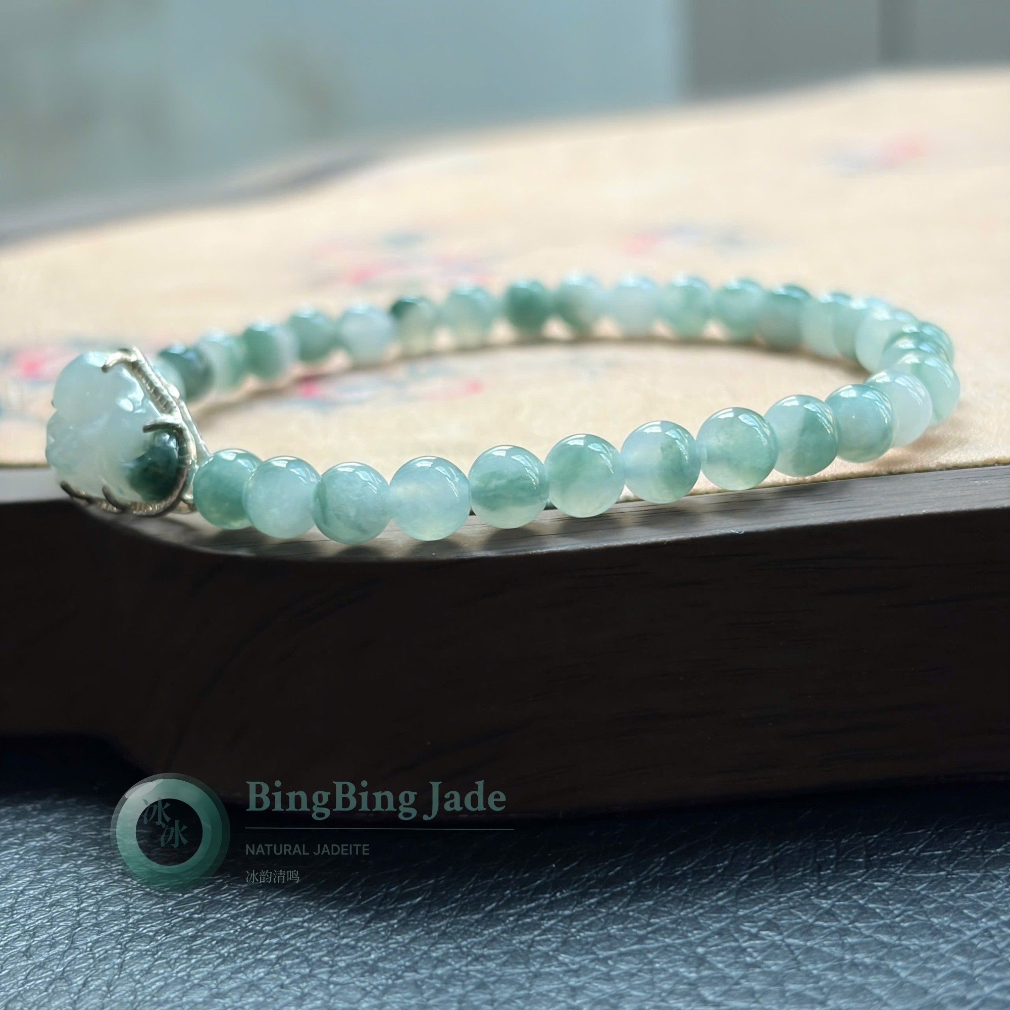 Icy Floating Blossom Jadeite Bead Bracelet 6mm — Moss Veils in Glacial Glass