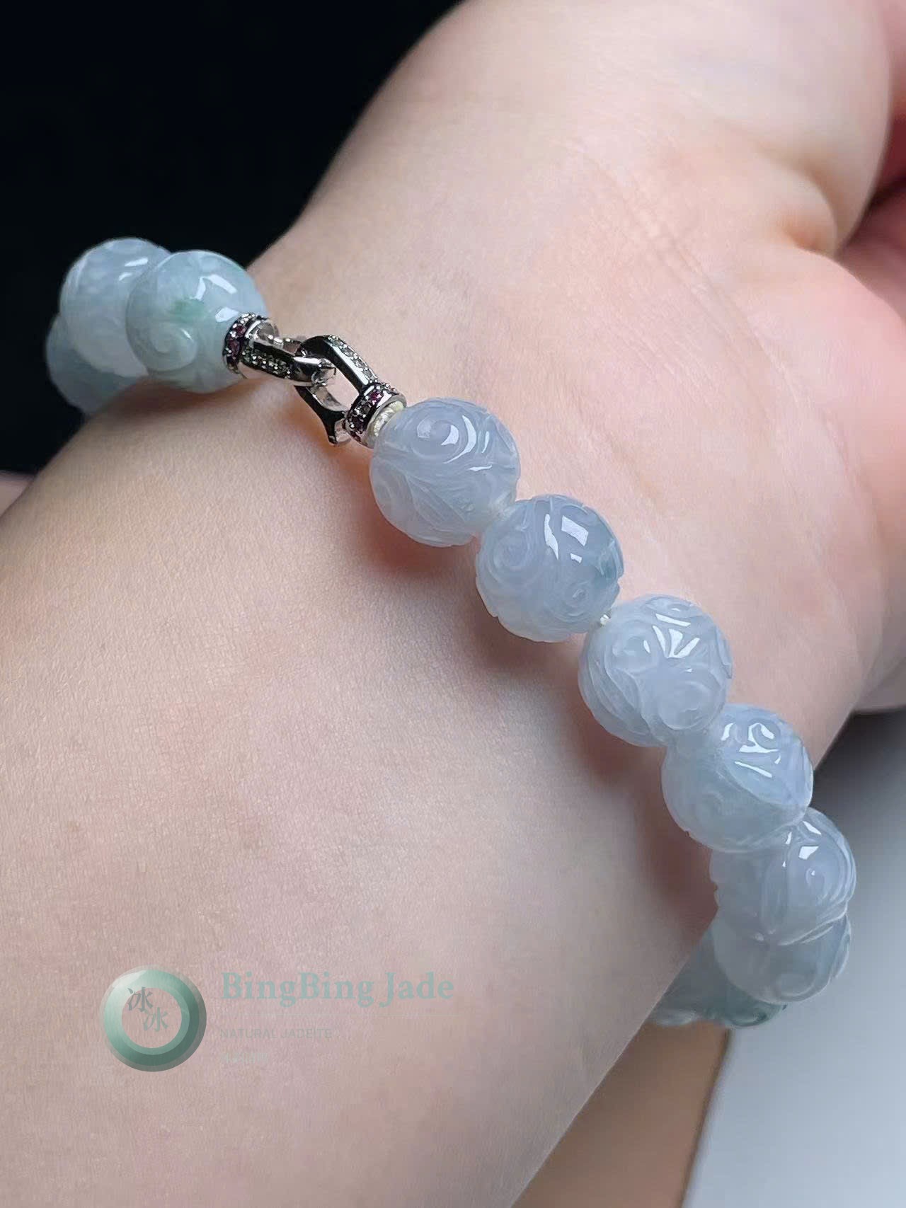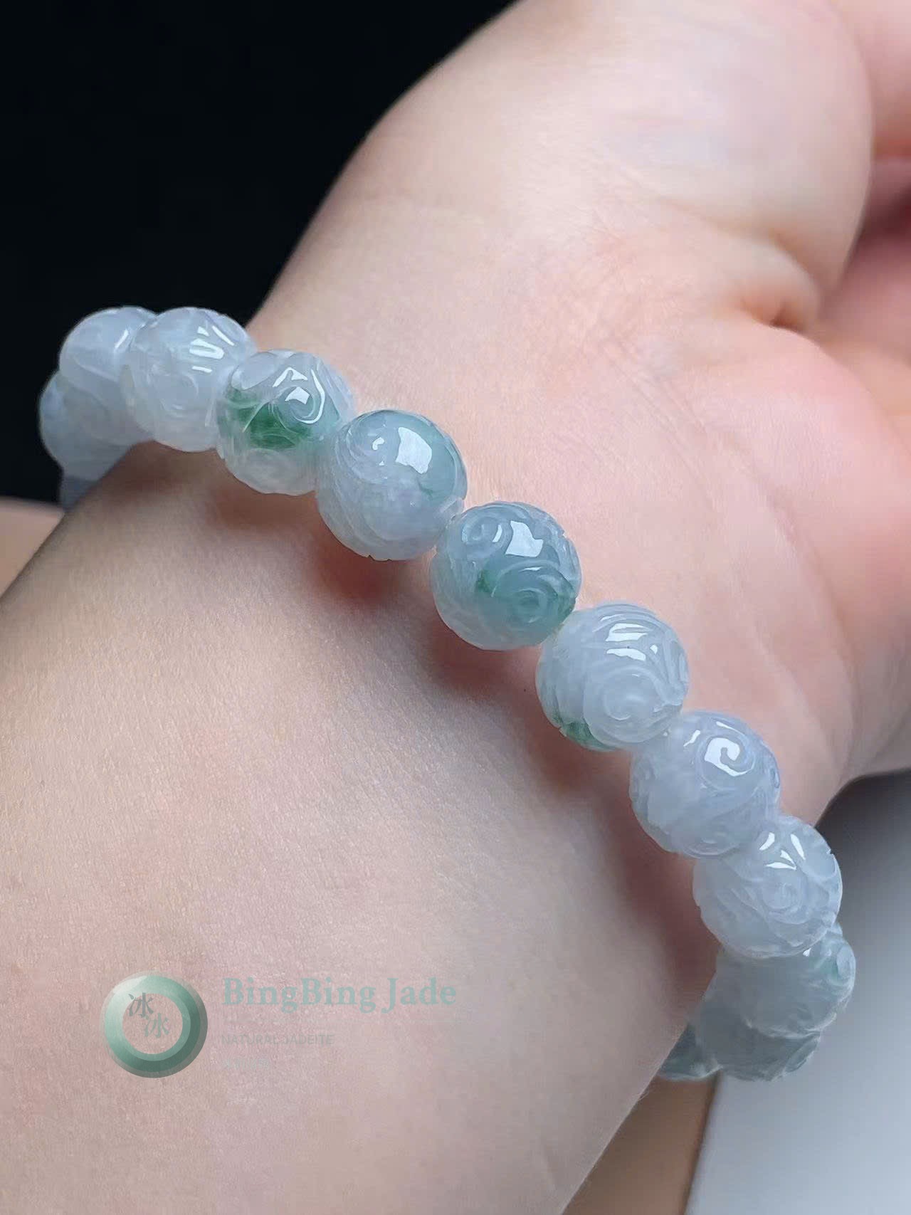 Carved Floating Blossom Beads — White/Blue Hue Jadeite Bracelet