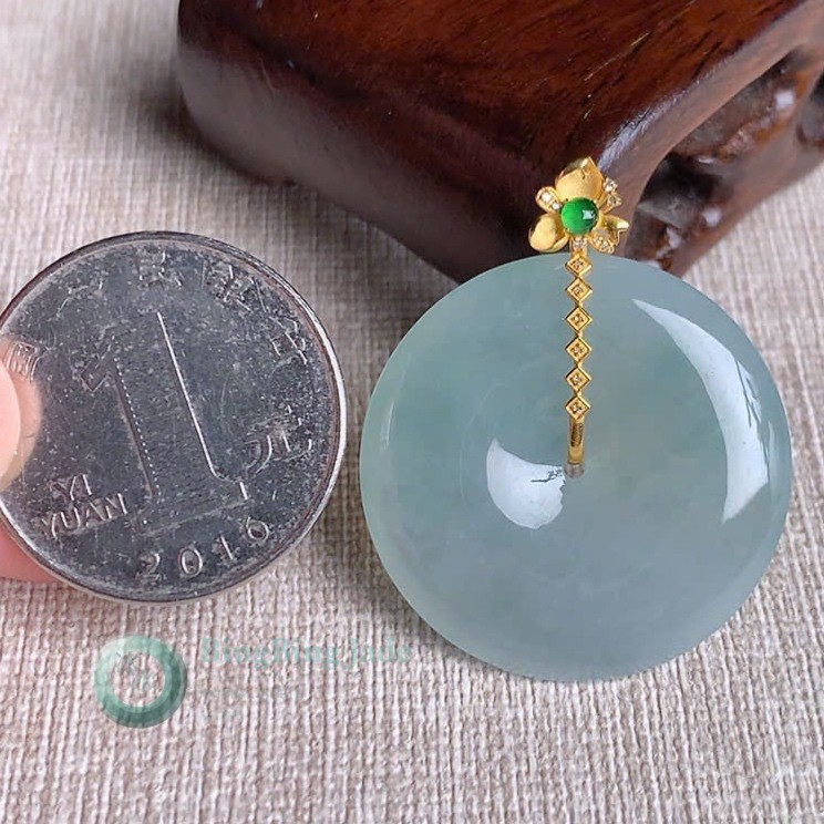 Celadon Ping An Kou Pendant with Gold Floral Bail — 36mm Disc
