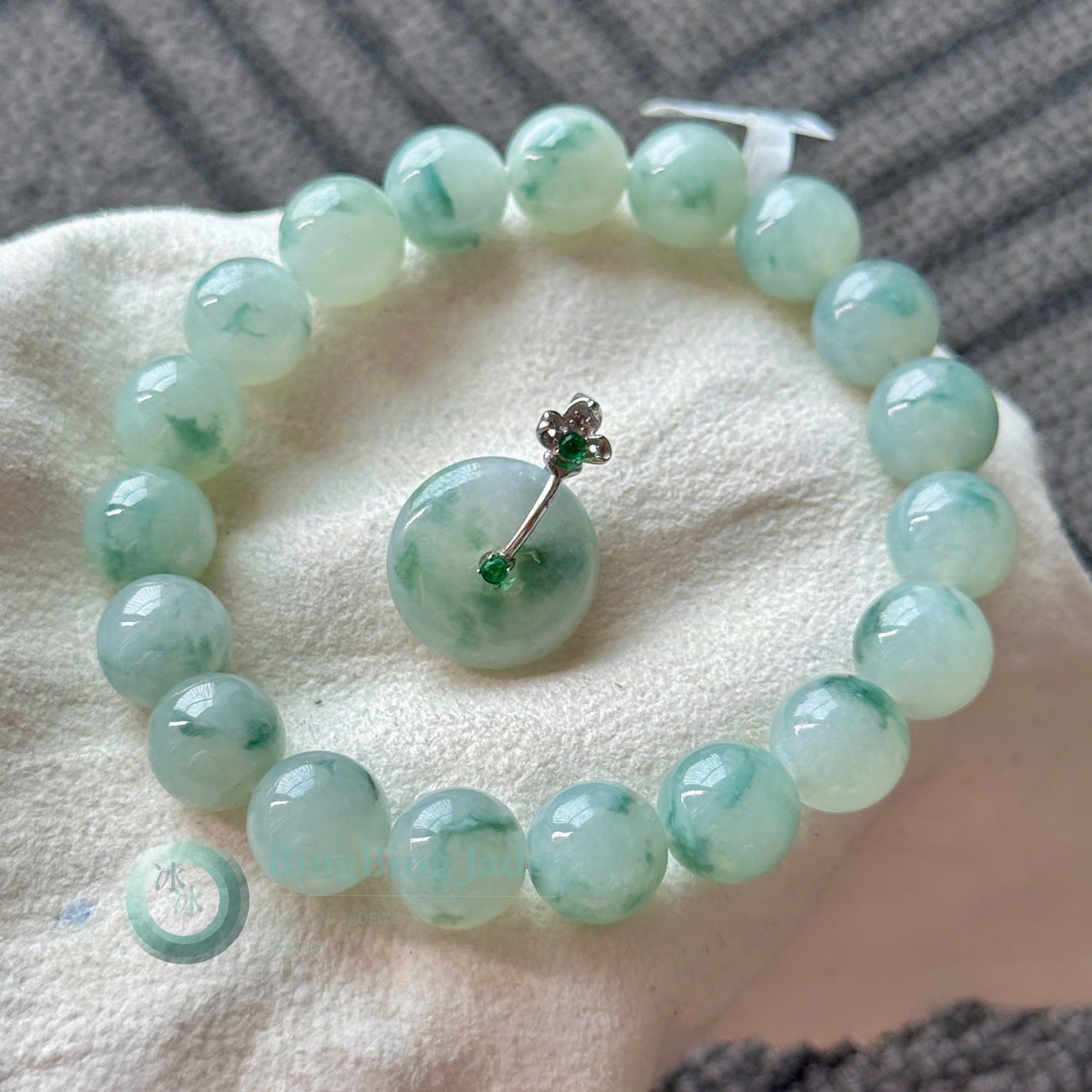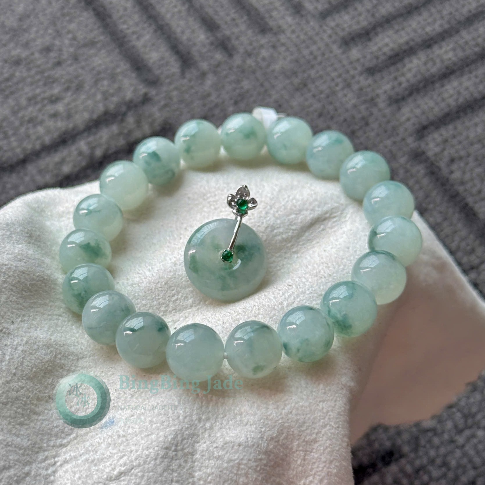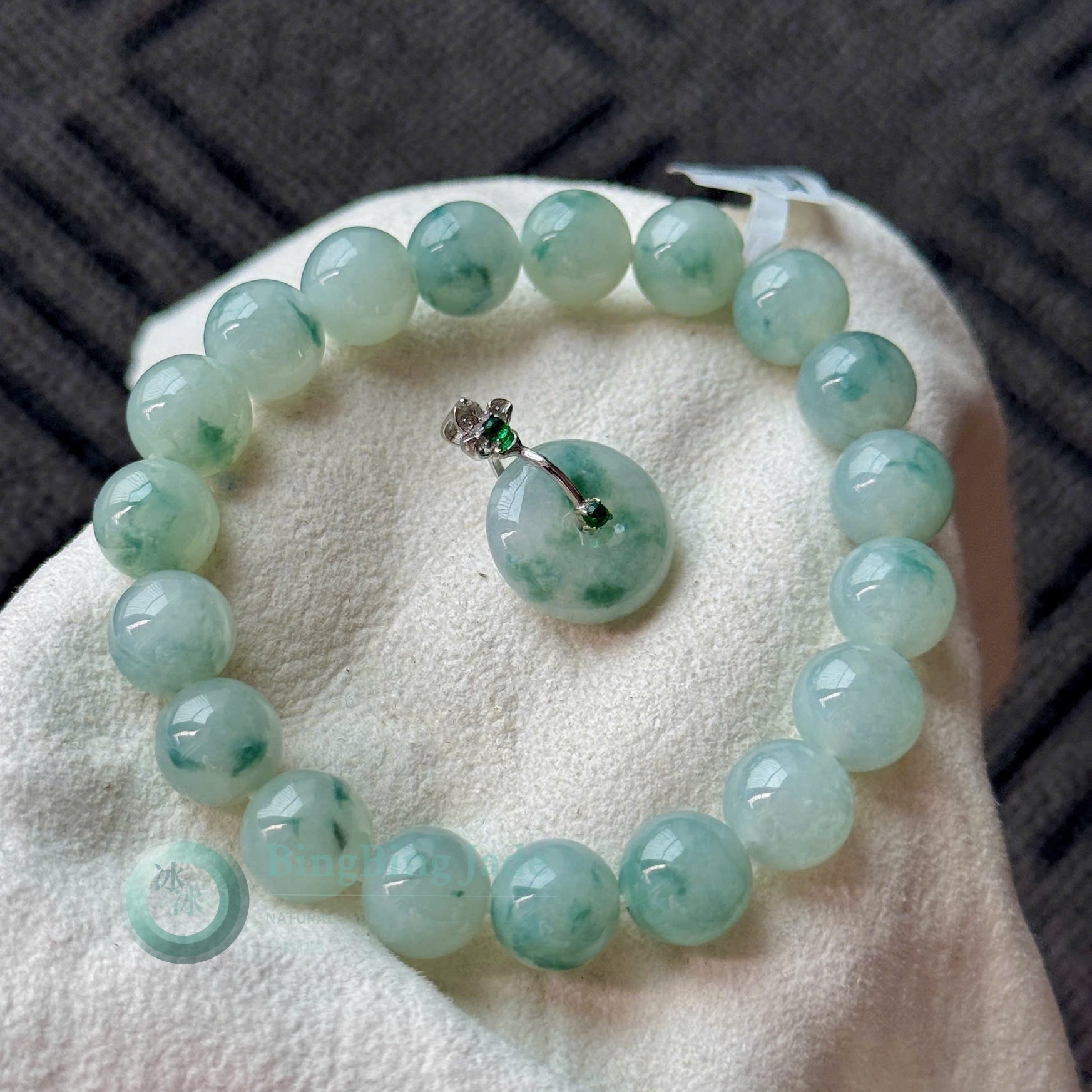 Floating Blossom Jadeite Bead Bracelet 10mm with Icy Donut Pendant Set