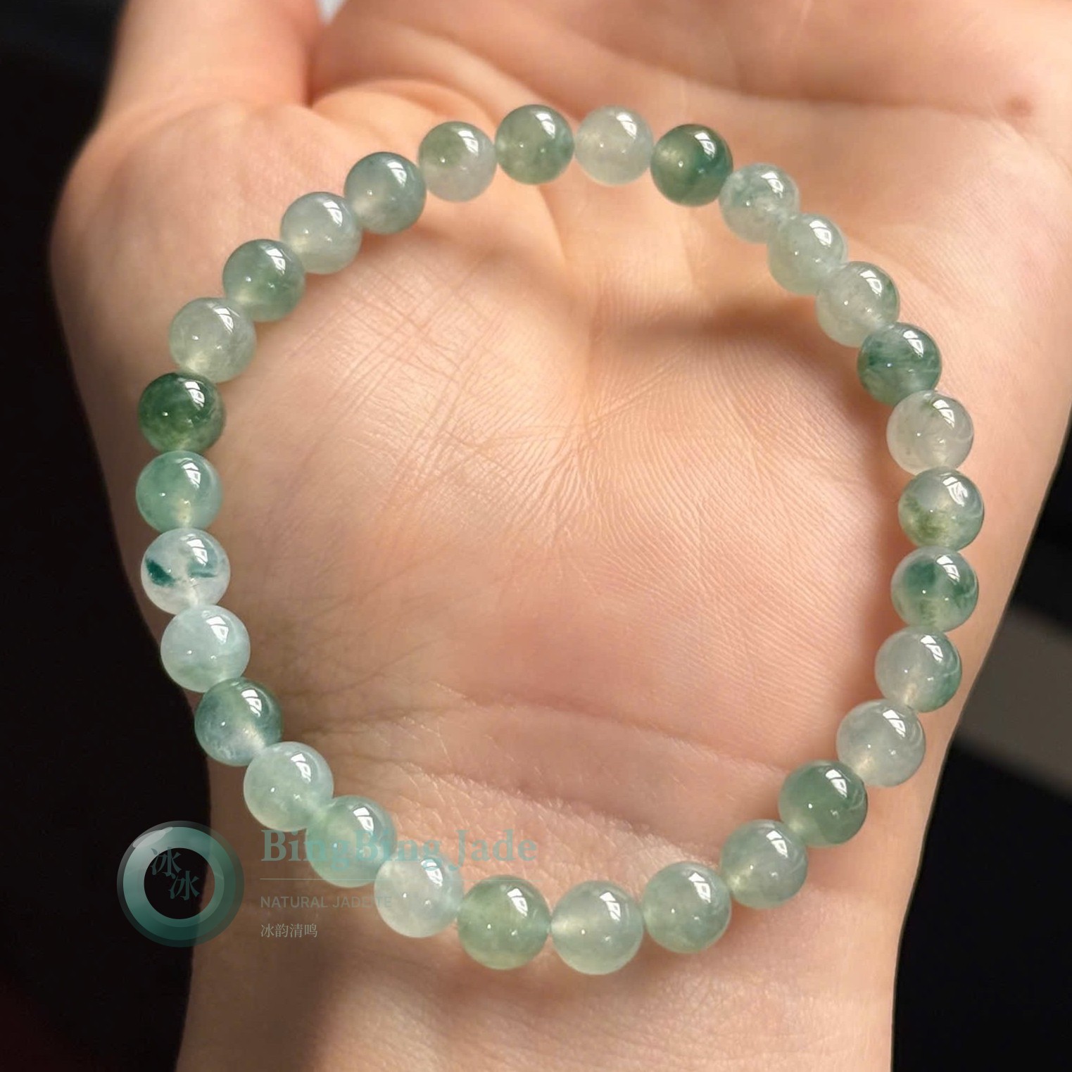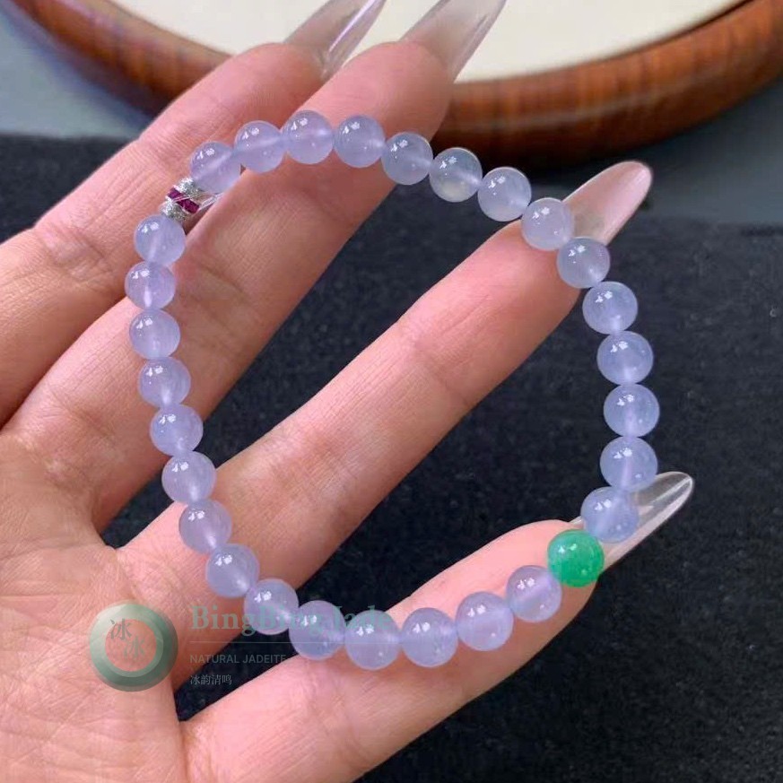 Icy Floating Blossom Jadeite Bead Bracelet 6mm — Moss Veils in Glacial Glass