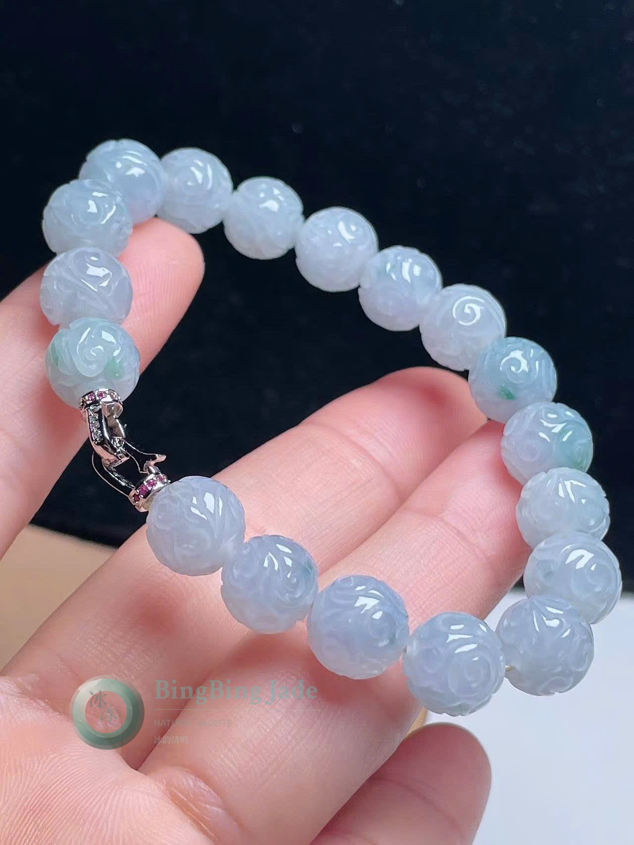 Carved Floating Blossom Beads — White/Blue Hue Jadeite Bracelet