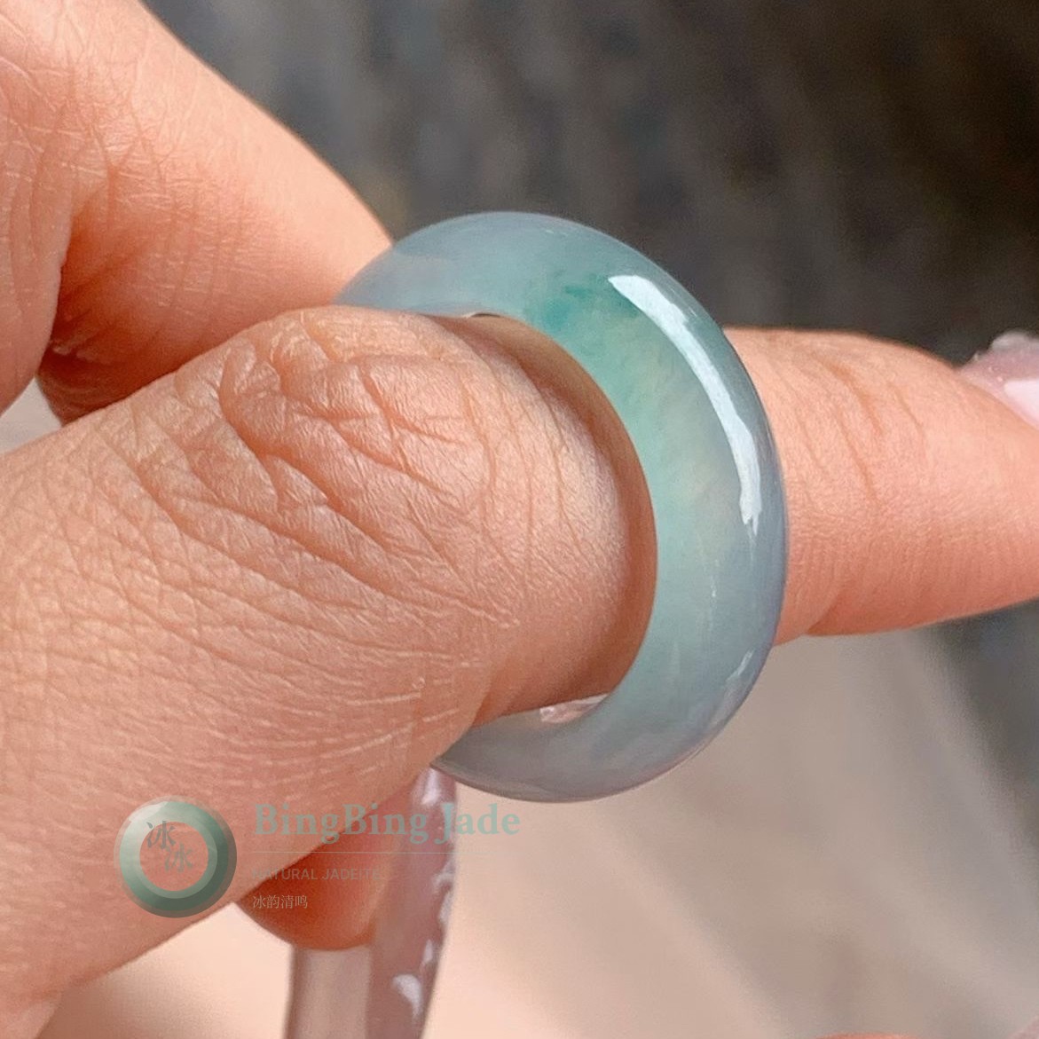 Icy Glacier Blue Jadeite Ring with Floating Green Wisps 17.5mm (US 6.75 - 7)