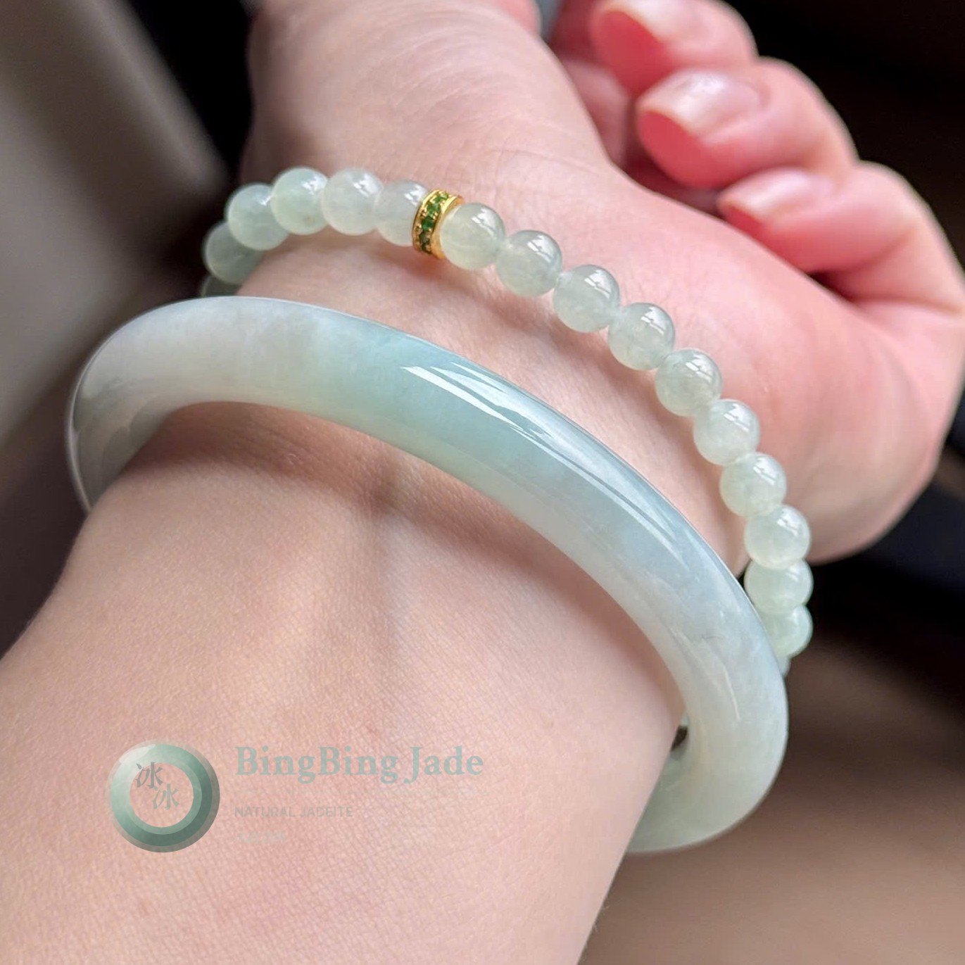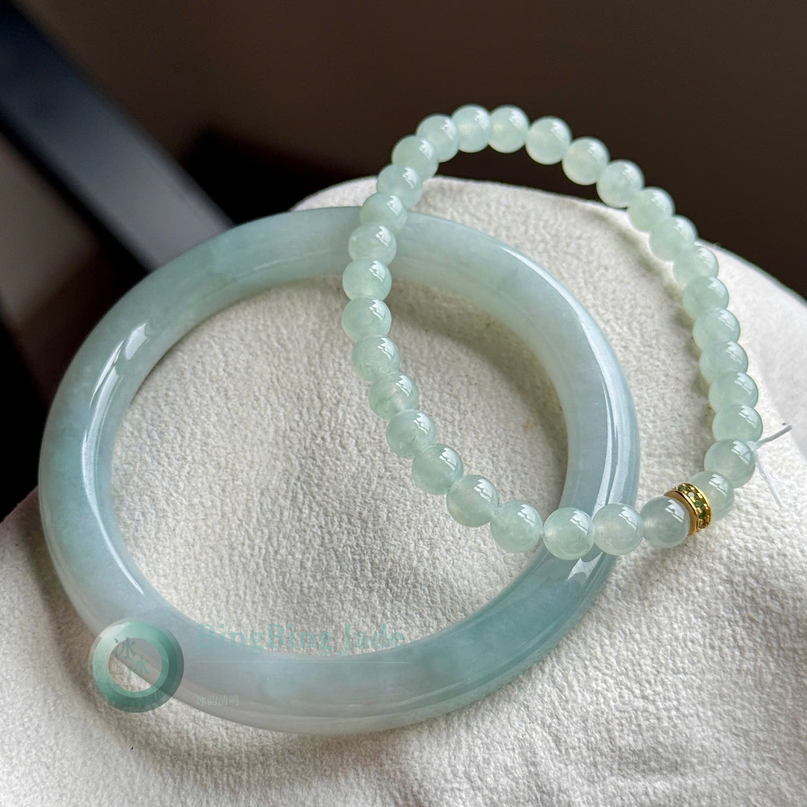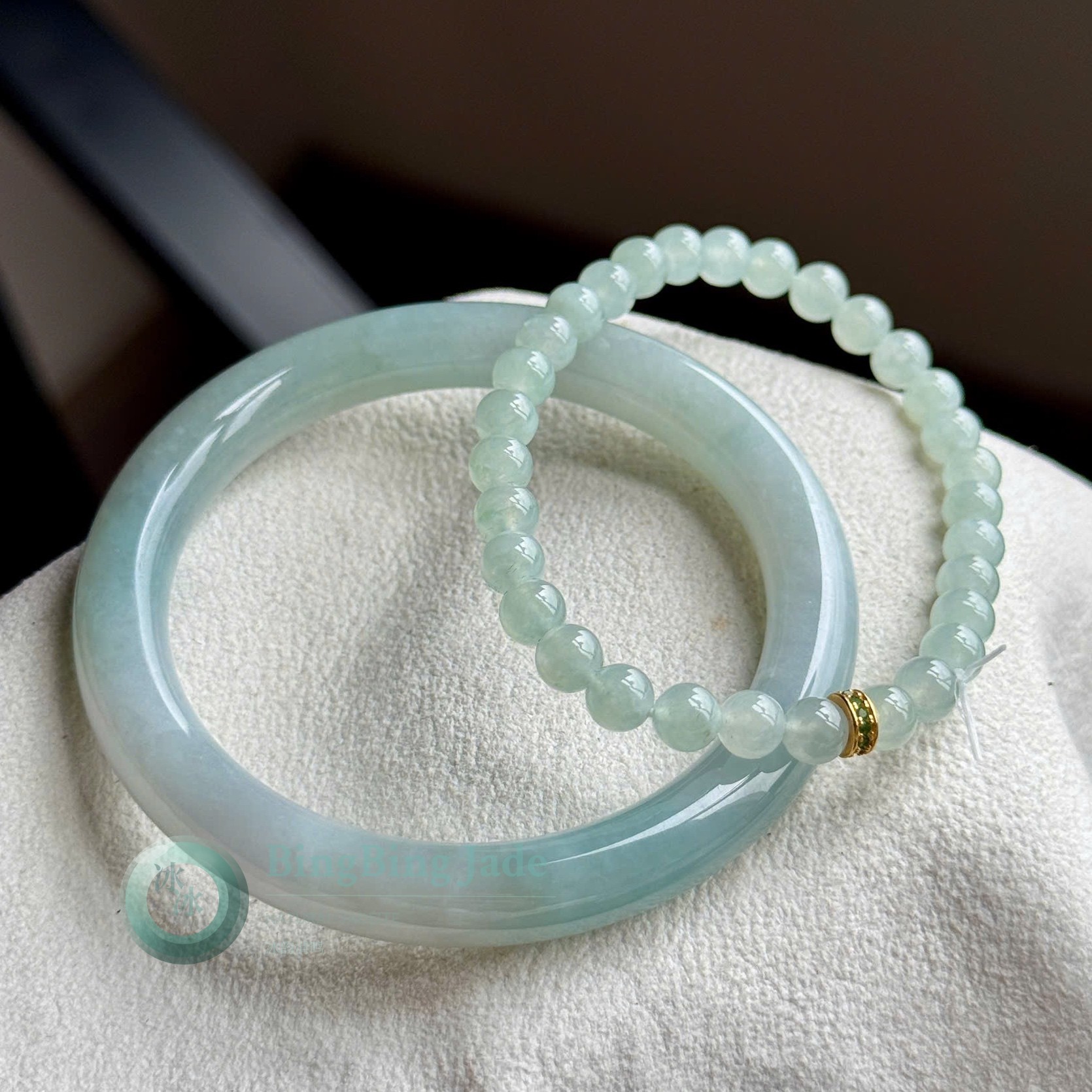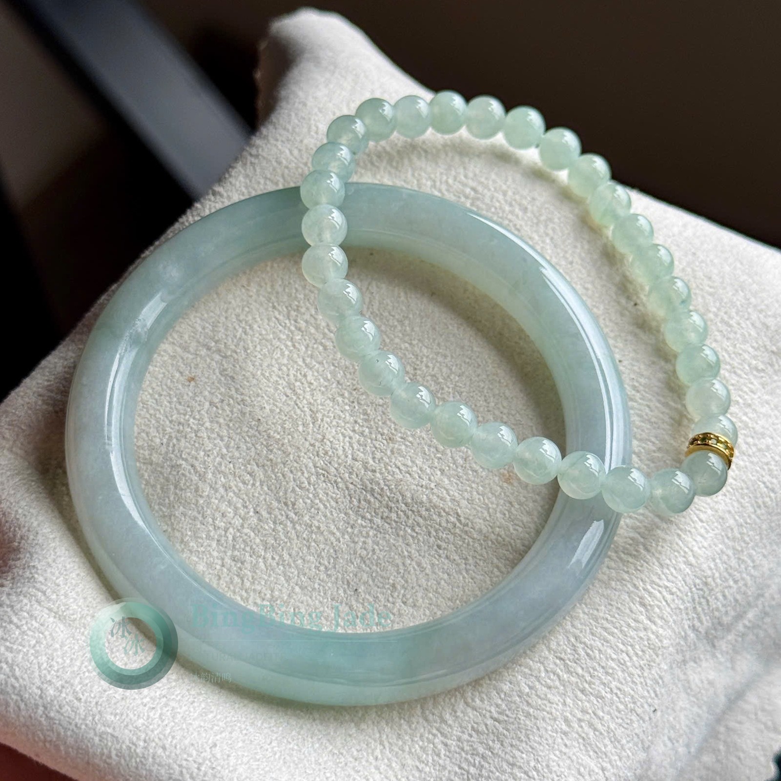 Glacial Teal Jadeite Bangle & Bead Bracelet Set — Soft Lam Glow, 56mm