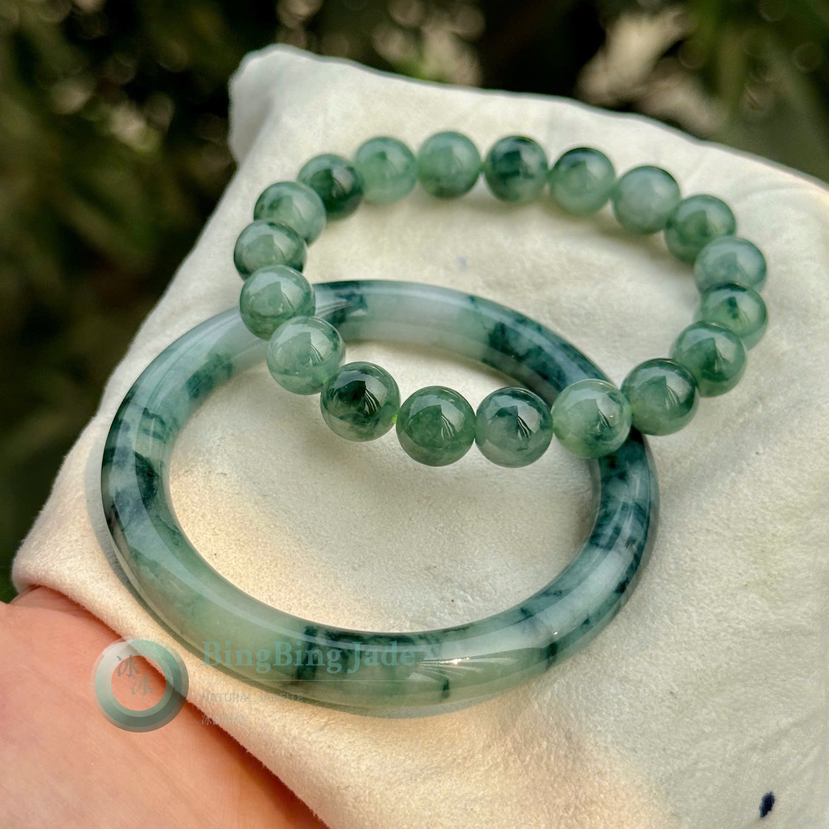 Ink-Wash Landscape Combo — Solid Bangle 53mm & Floating Emerald Bead Bracelet 9.8mm