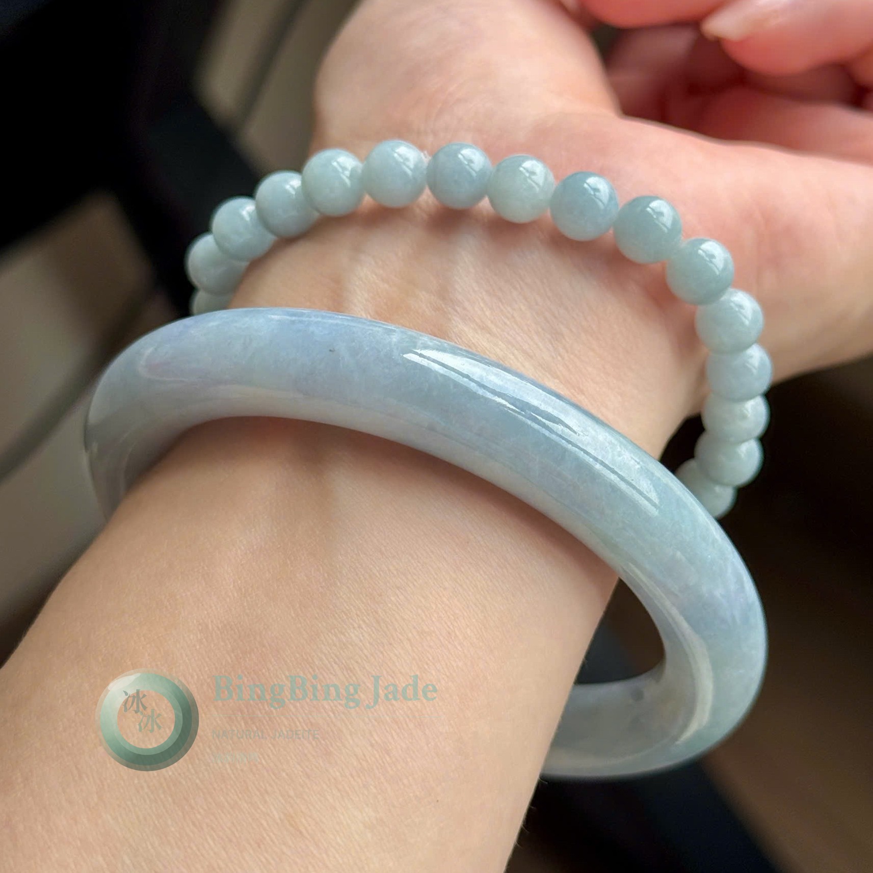 Lavender-Blue Mist Glutinous Jadeite Bangle & Bead Bracelet Set 60mm