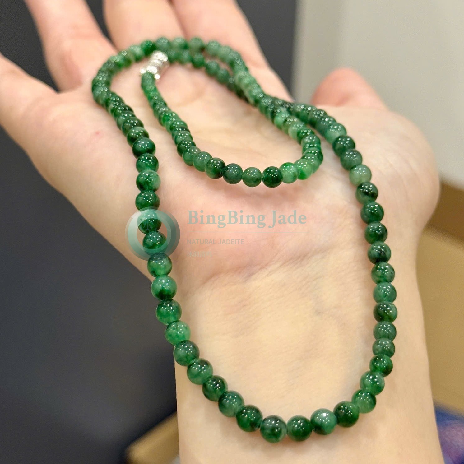 Scattered Emerald Blooms on Green — Jadeite Bead Necklace ~6.5mm
