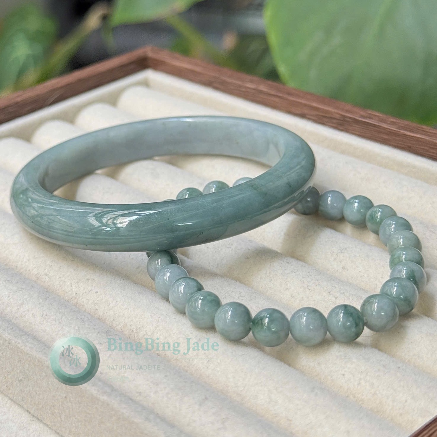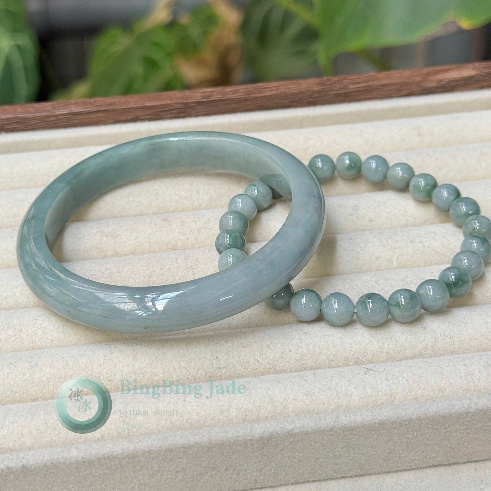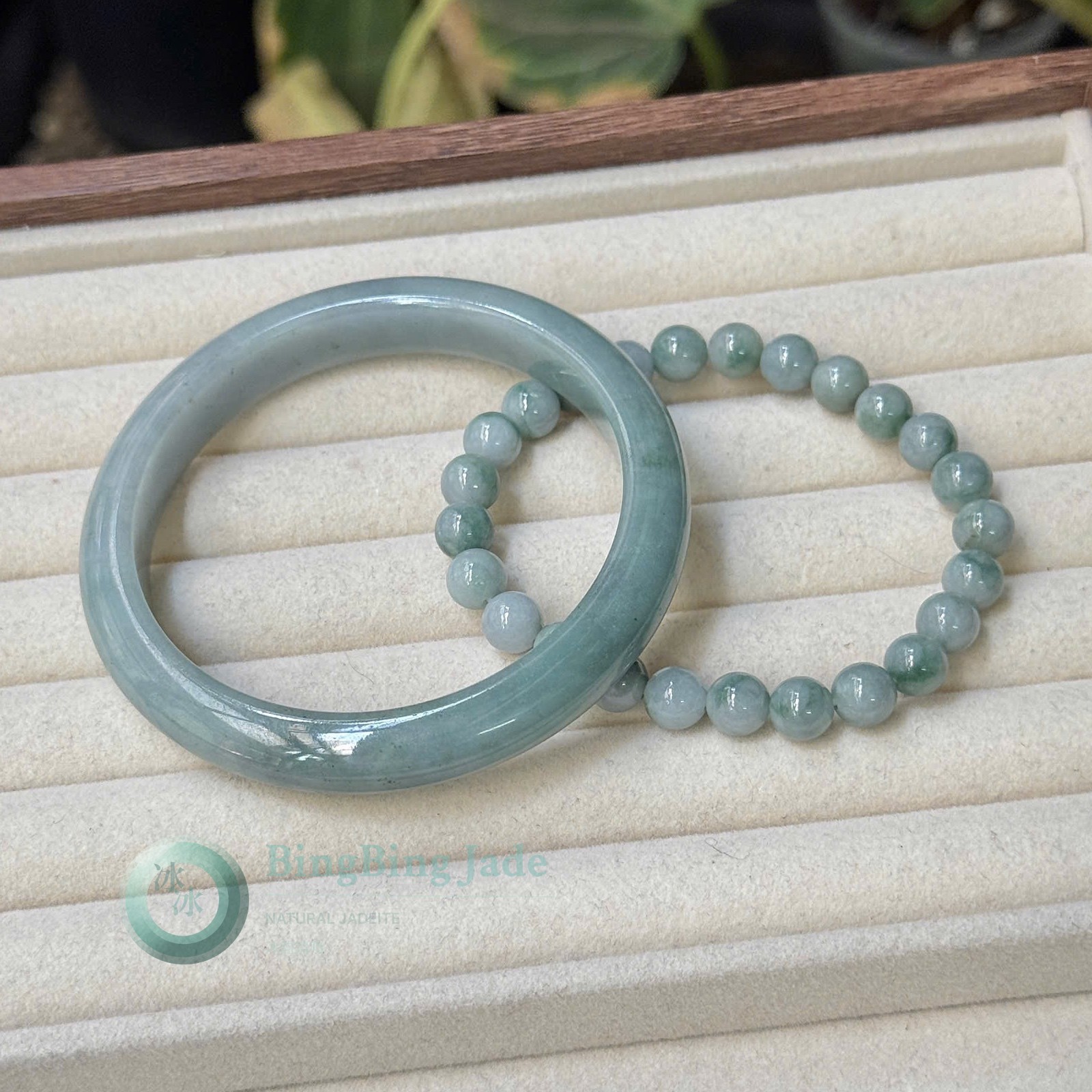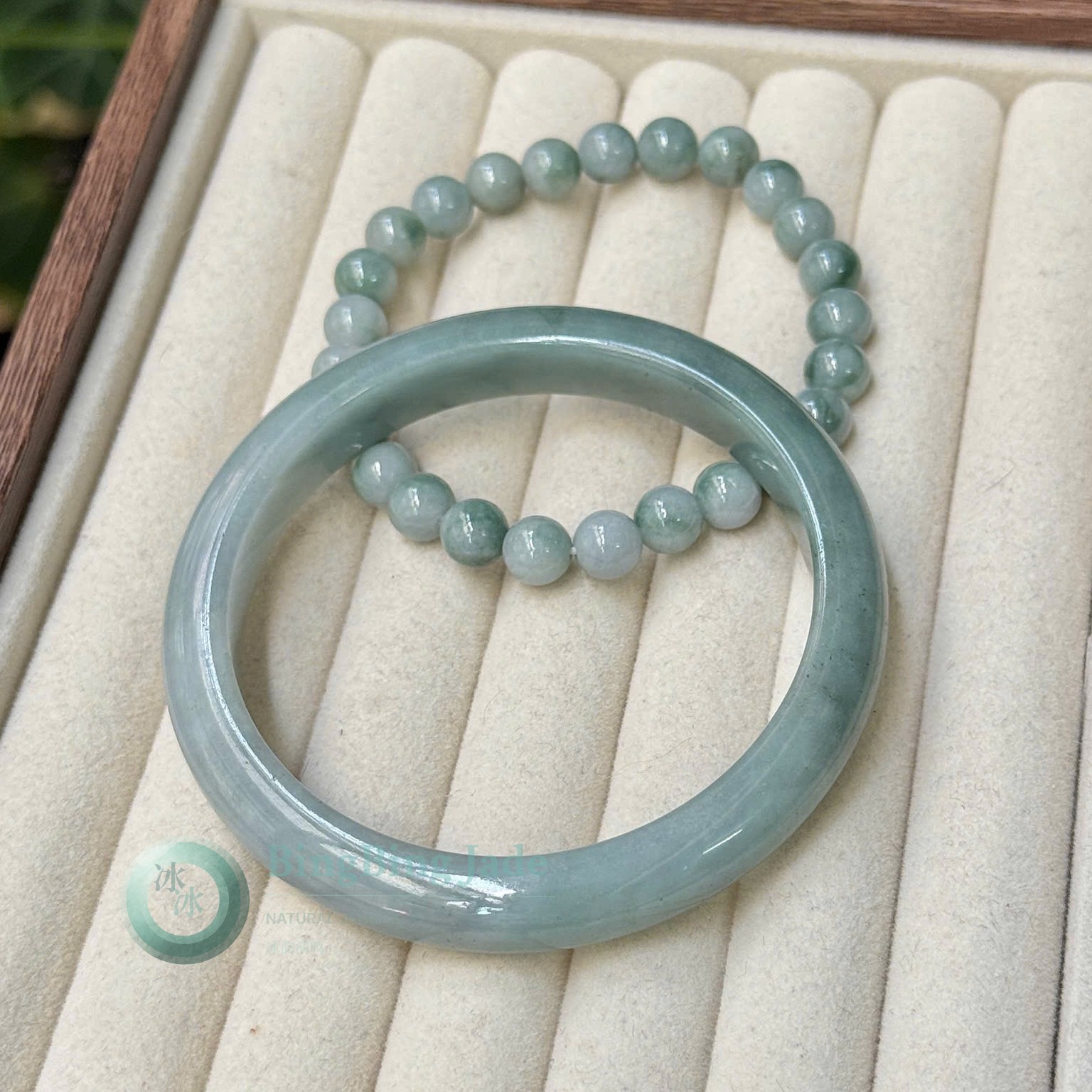 Glacial Teal Jadeite Bangle & Bead Bracelet Set — Soft Lam Glow, 56mm