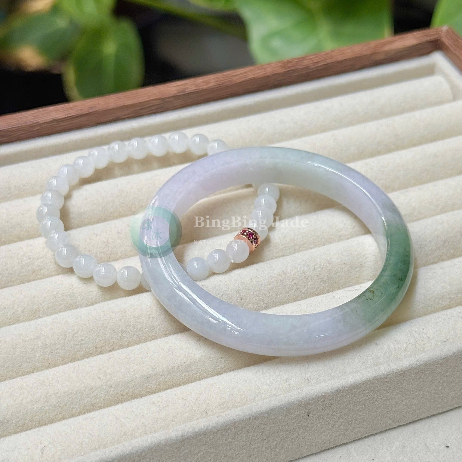 Lavender Mist with Floating Green Kiss — Jadeite Bangle 56.5mm