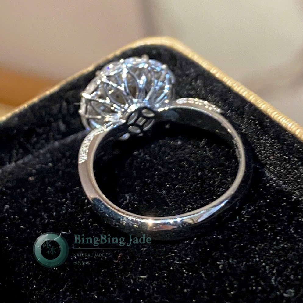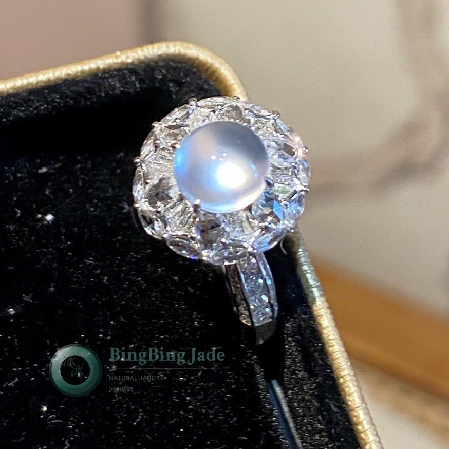 White Dragon Icy White Longshi Jadeite Ring in 18K Gold & Crystal Halo