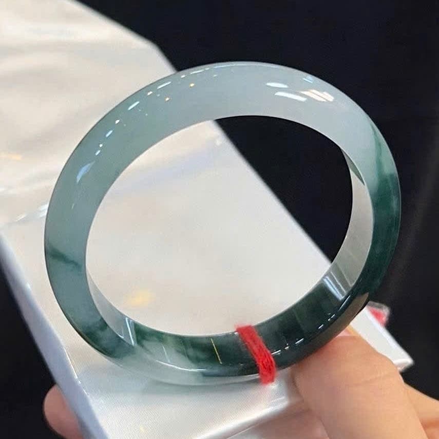 A striking jadeite bangle featuring a translucent icy base transitioning into rich, deep green hues that flow naturally through the piece. The color forms a beautiful floating pattern, resembling forest shadows drifting across misty water. The jade displays a clean, watery translucency with strong light penetration, especially in the lighter sections, while the darker green areas add depth and dramatic contrast. This interplay between icy clarity and concentrated color gives the bangle a dynamic, landscape-like character. Well-polished with balanced proportions, the piece feels both substantial and elegant on the wrist.