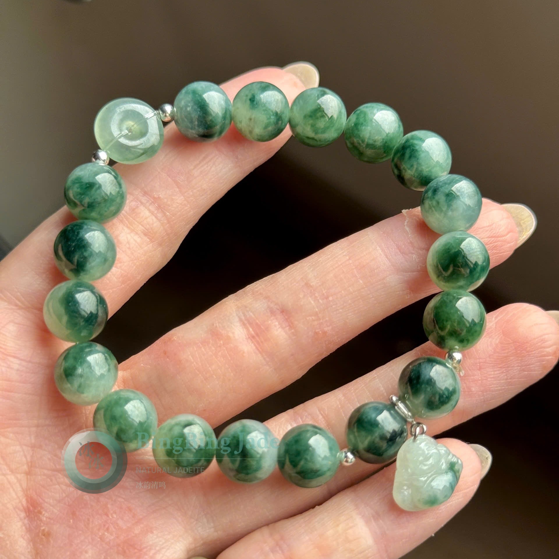Misty Forest Floating Green Jadeite Bead Bracelet 10mm with Laughing Buddha Charm