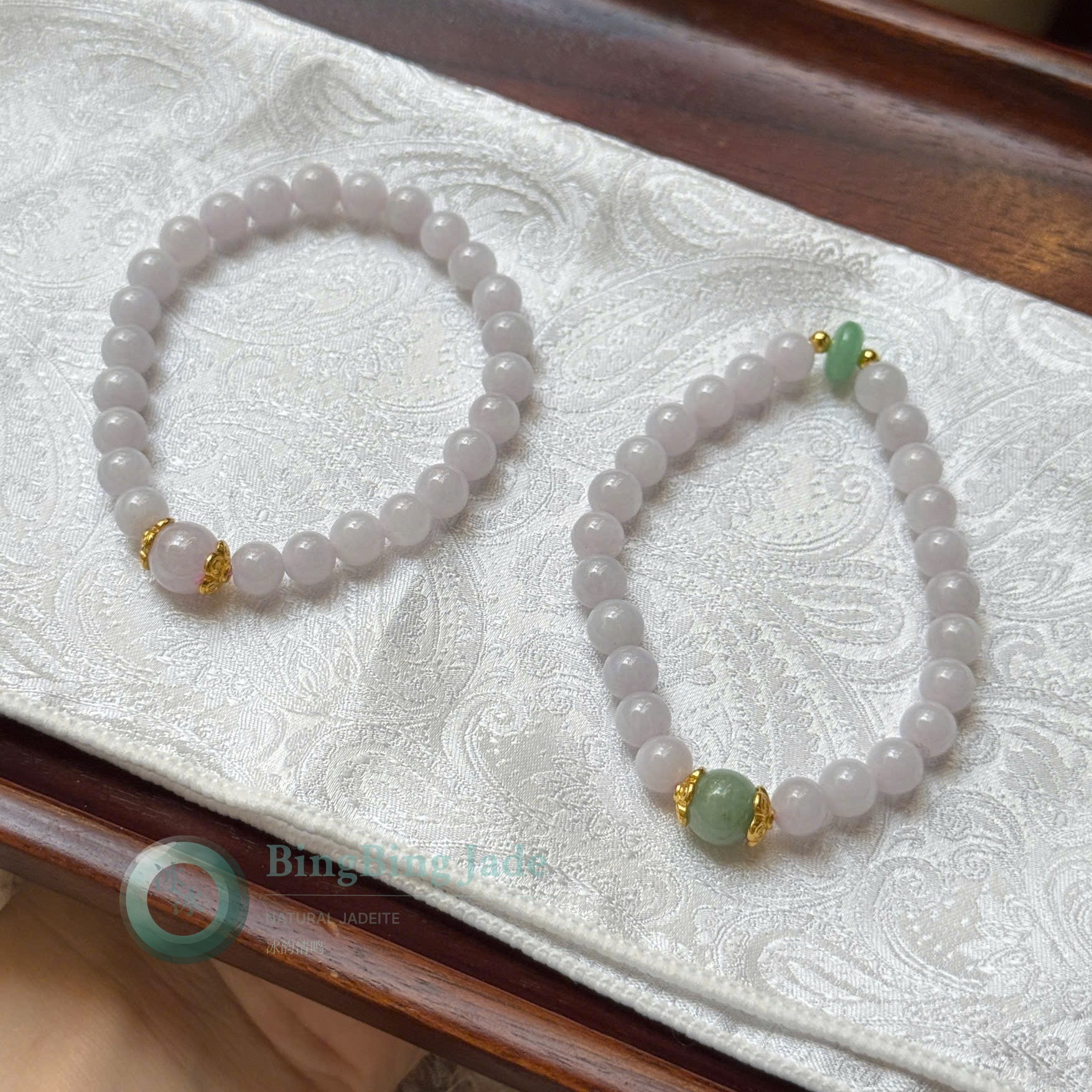 Lavender Mist Jadeite Bracelet Set with Green Jade Accents — 6.9mm Beads