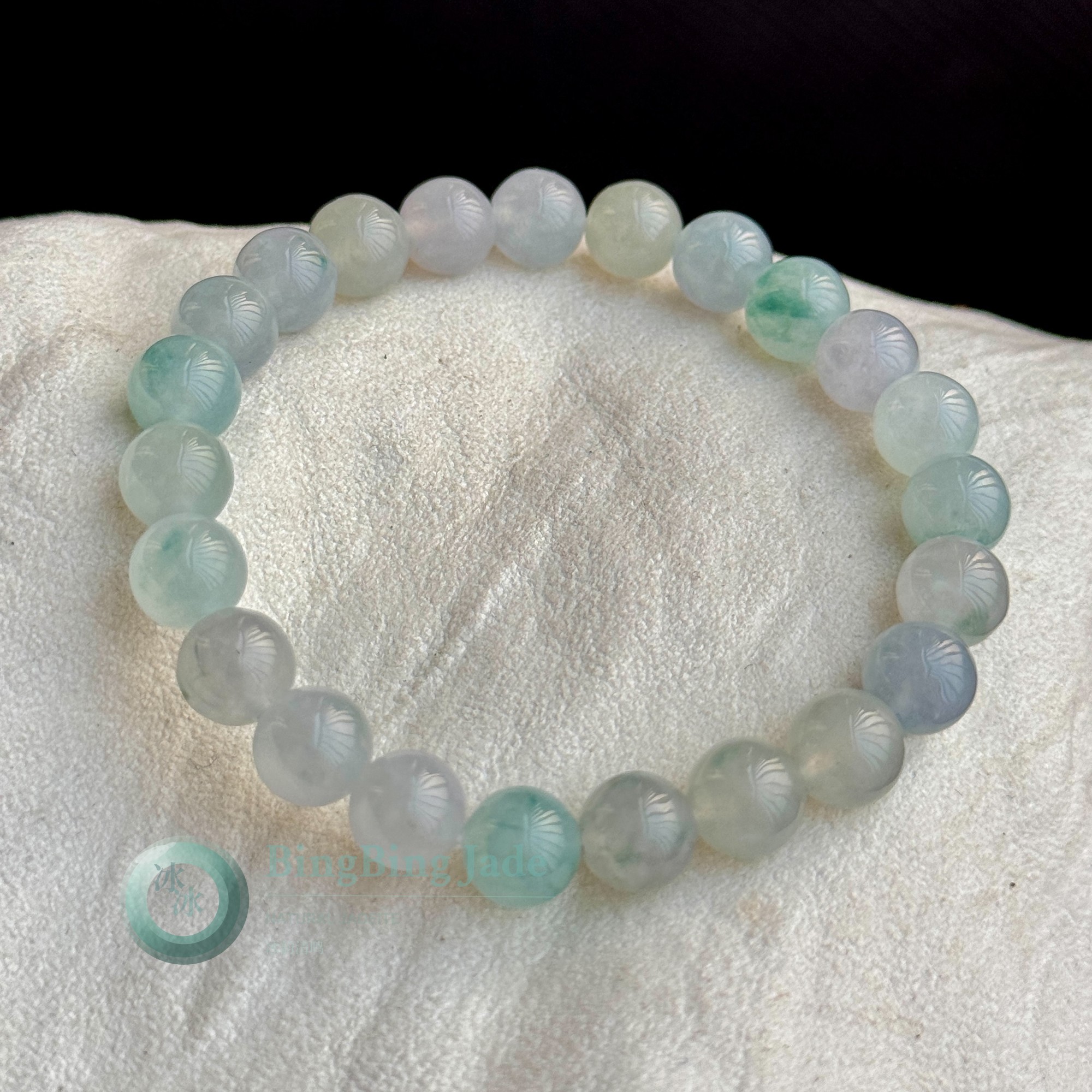 Carved Lotus Beads in Icy Celadon & Seafoam — Multi-Hue Jadeite Bracelet