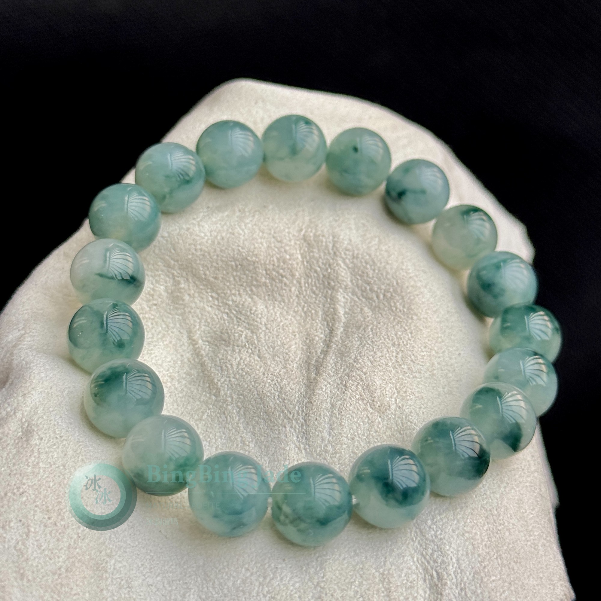 Icy Floating Blossom Jadeite Bead Bracelet 6mm — Moss Veils in Glacial Glass