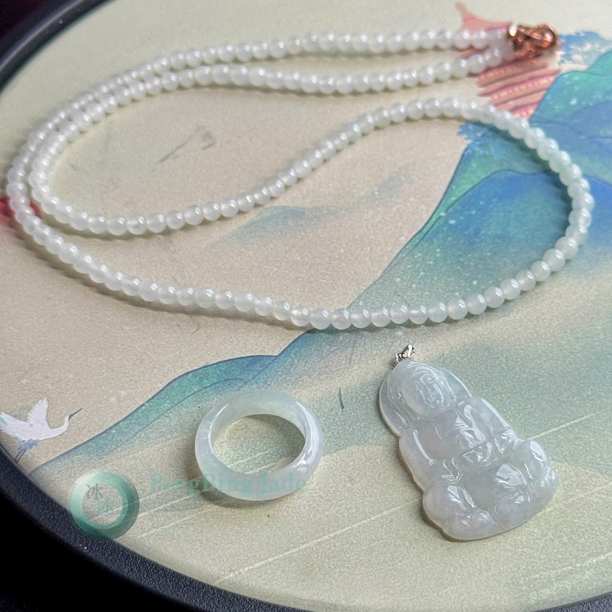 Icy White Guanyin Pendant Combo — Bead Necklace, Pendant & Translucent Band Ring