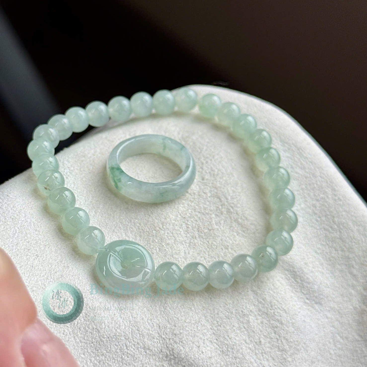 Icy Glutinous Jadeite Bead Bracelet with Donut Charm & Matching Band Ring Set