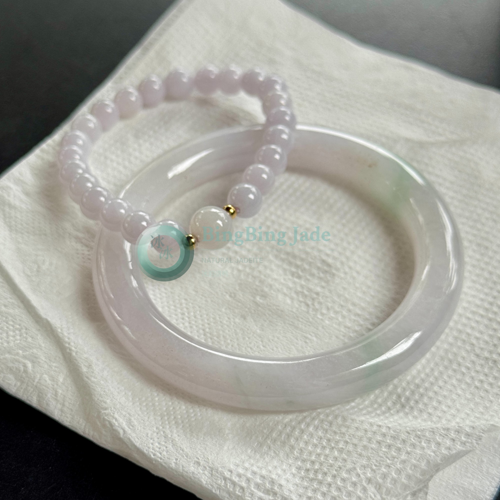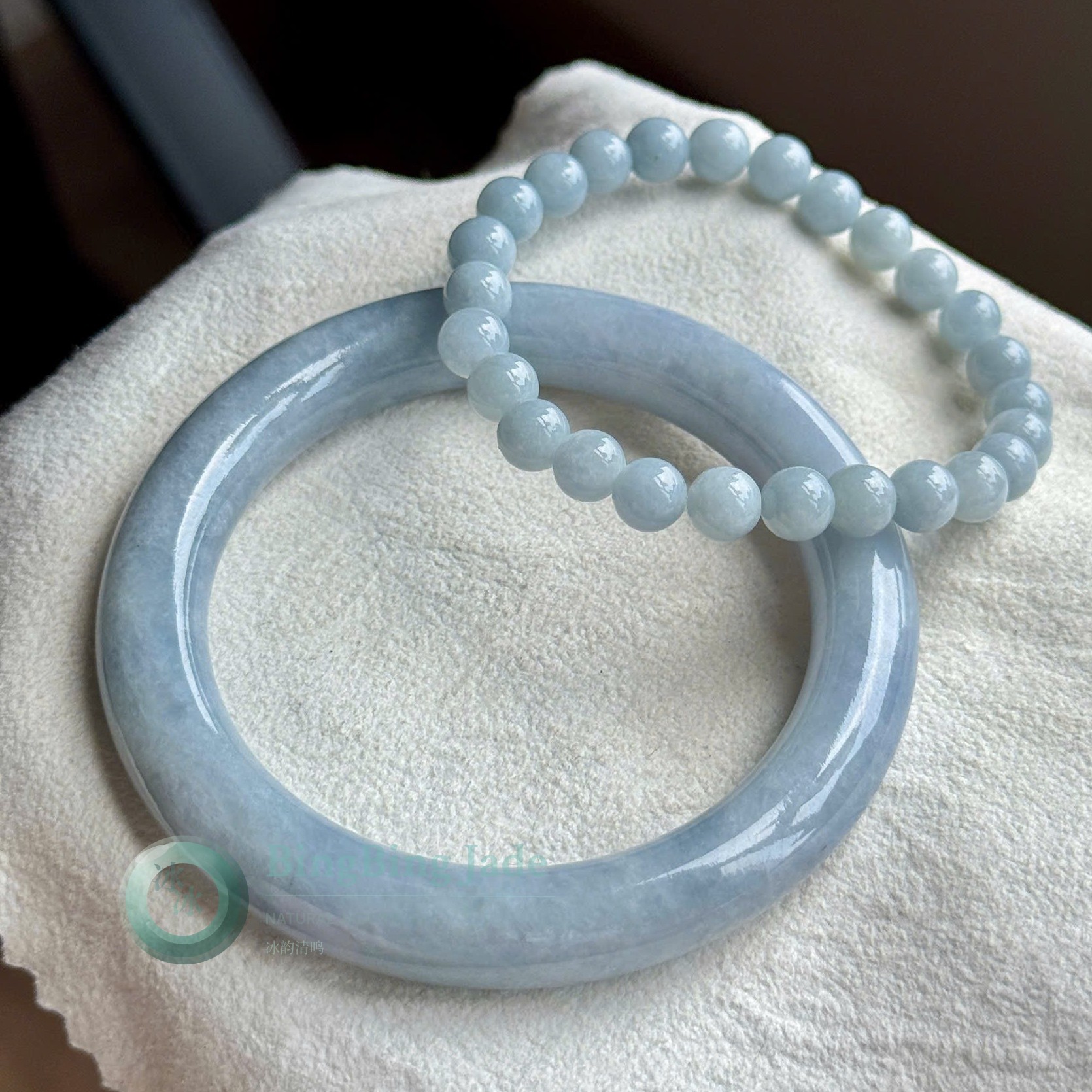 Lavender-Blue Mist Glutinous Jadeite Bangle & Bead Bracelet Set 60mm