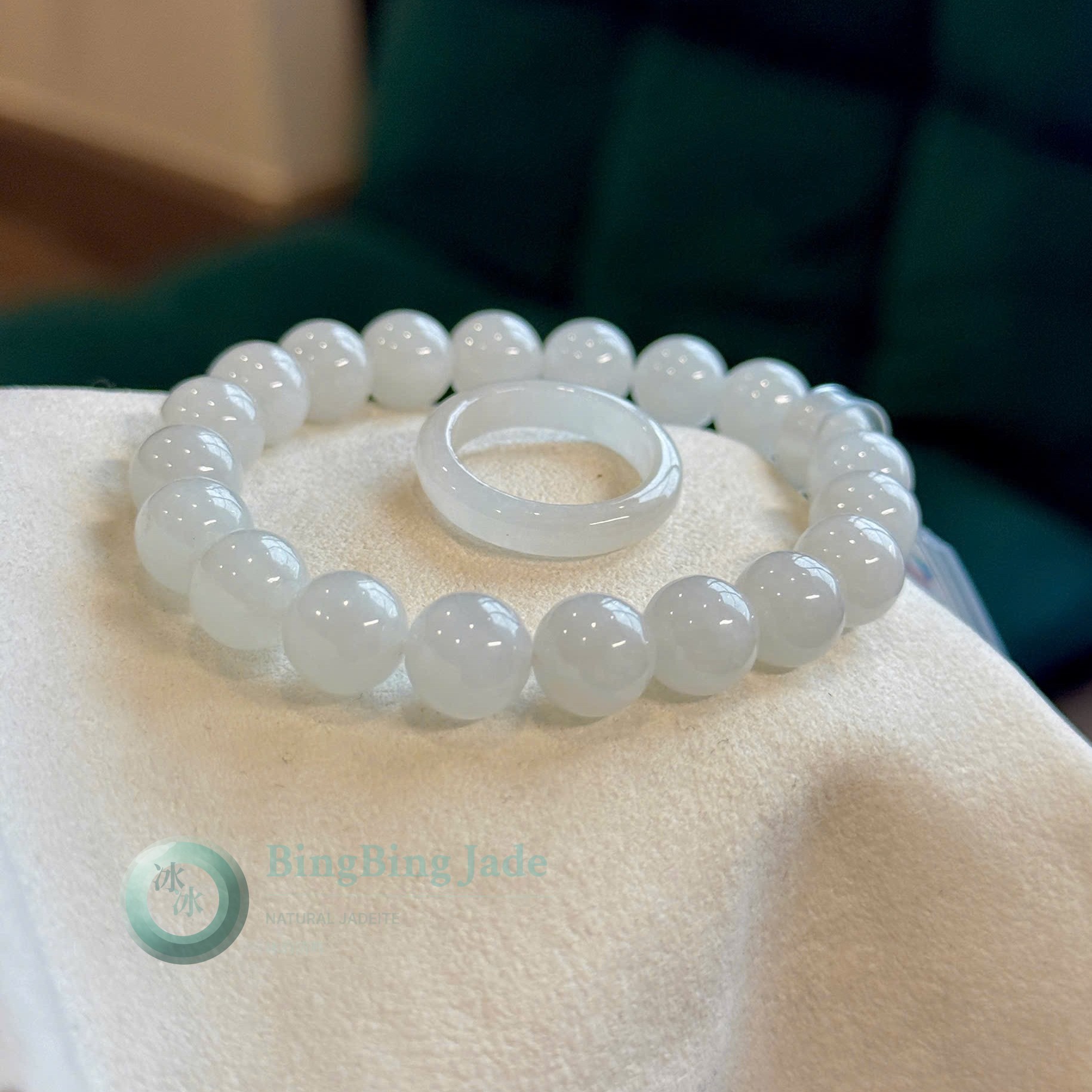 Pure Snow Icy White 10mm Bead Jadeite Bracelet & Ring Set