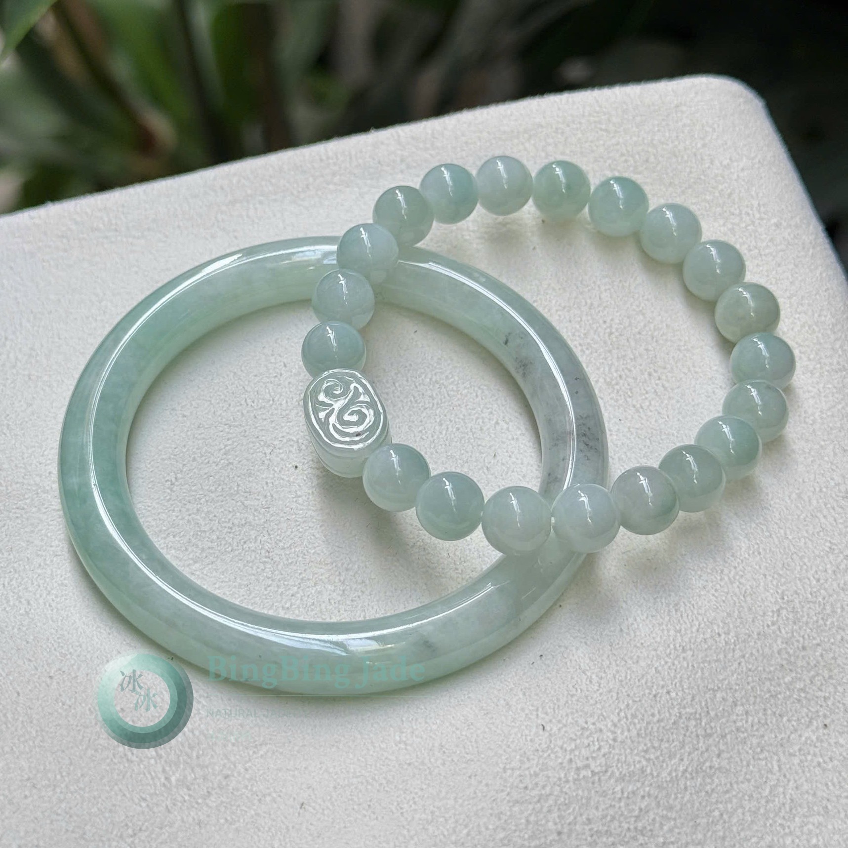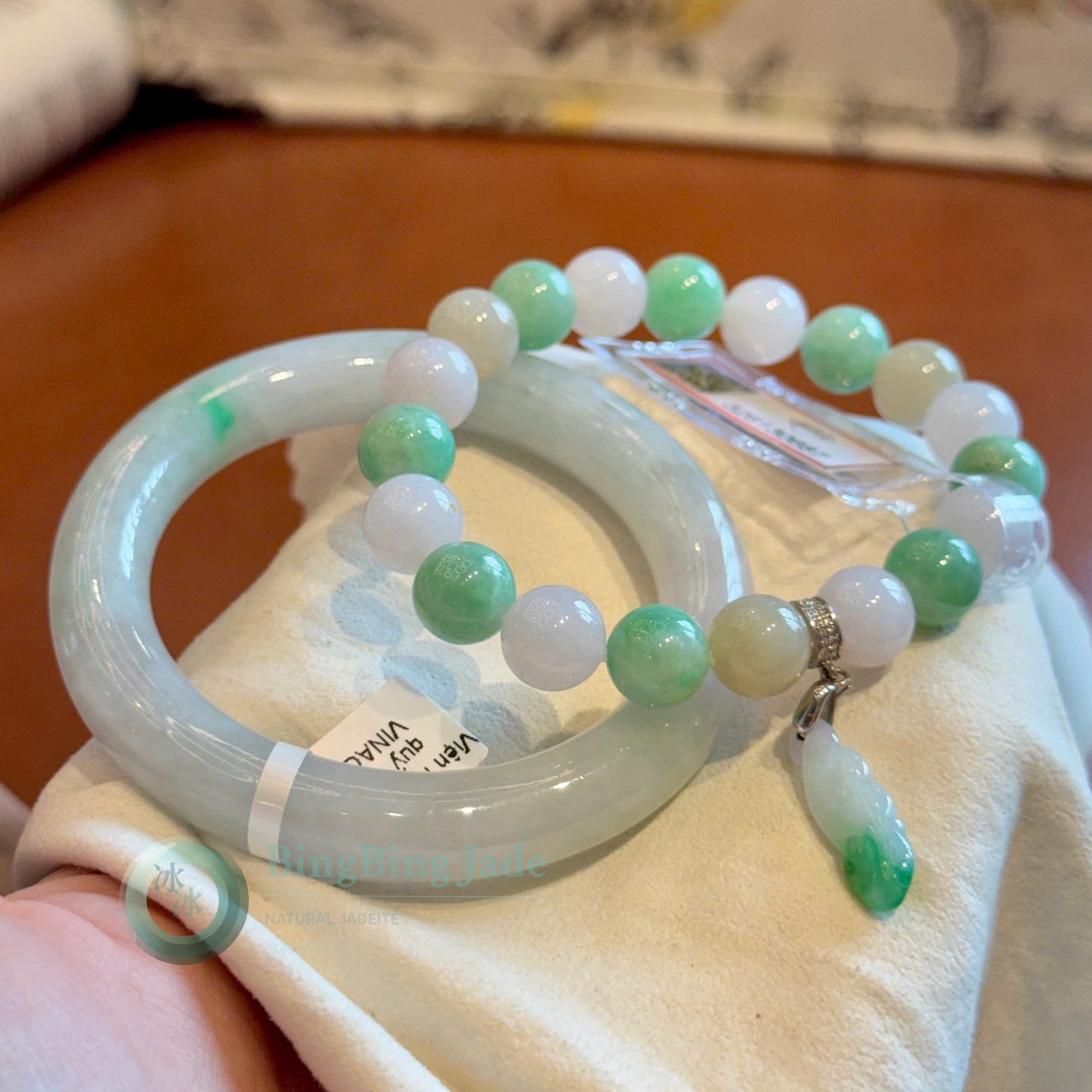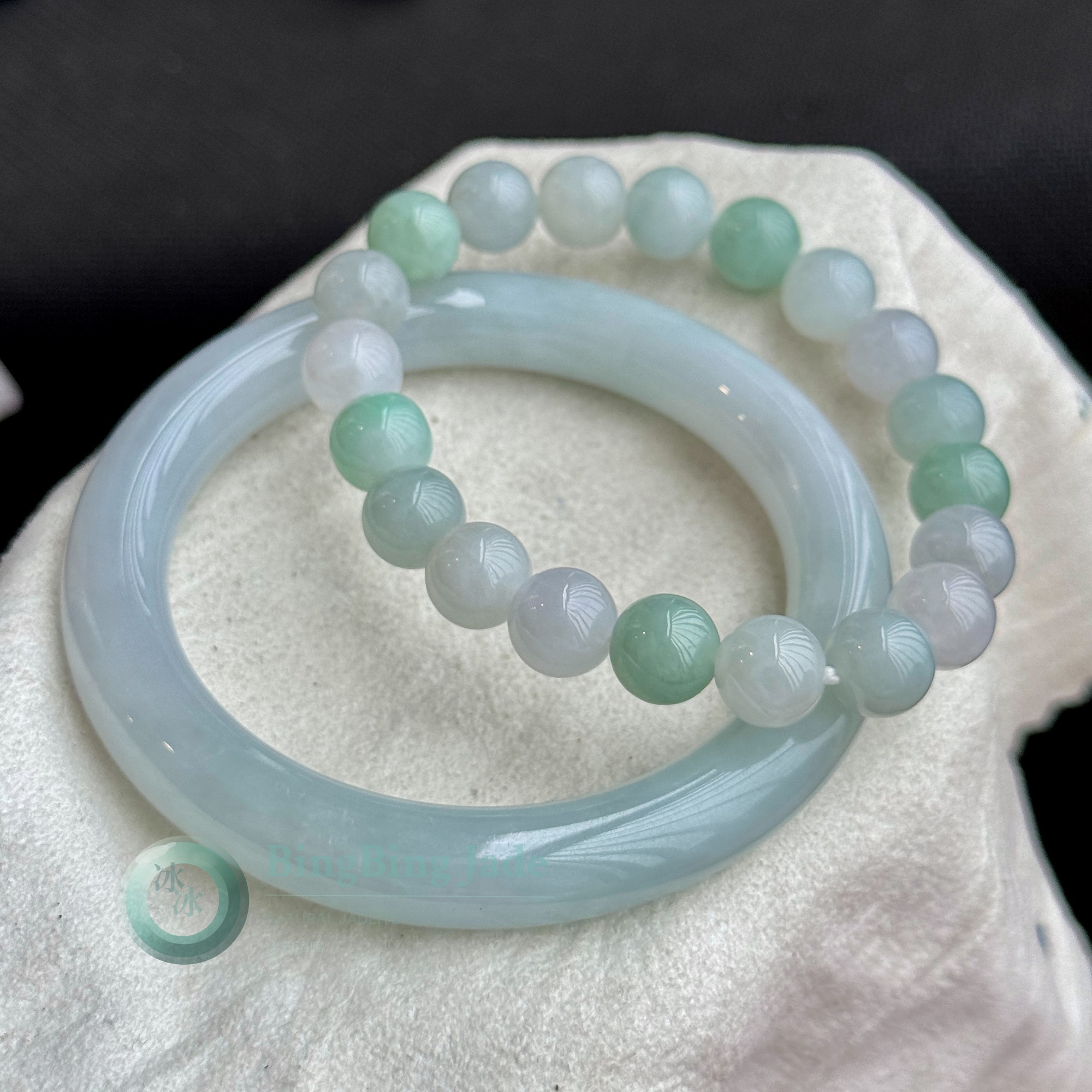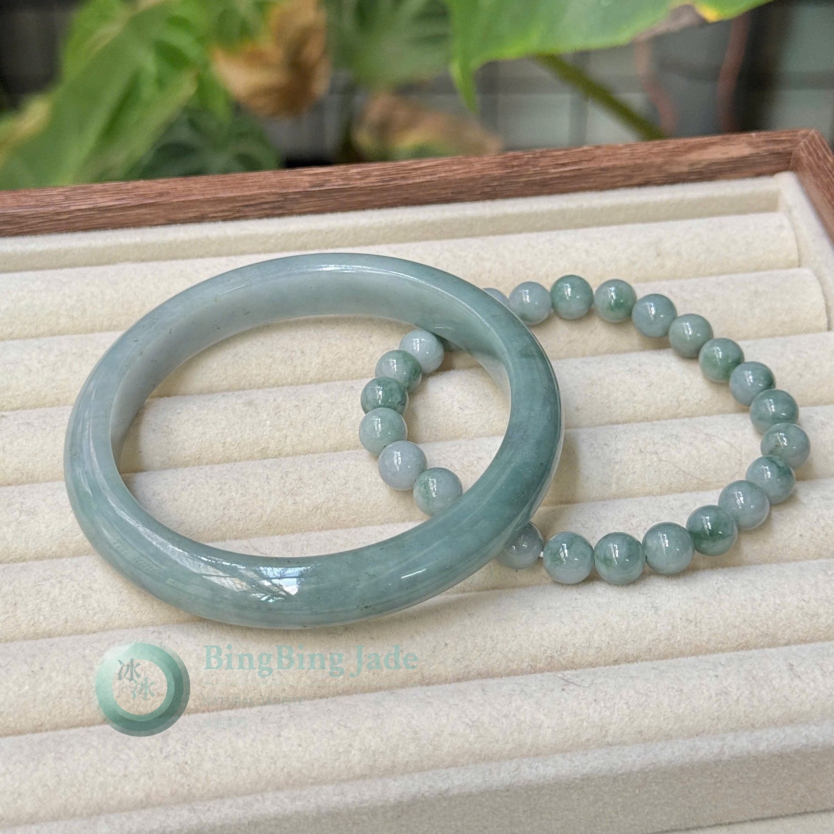 Moss & Mist Jadeite Bangle 53.7mm with Matching Bead Bracelet Set