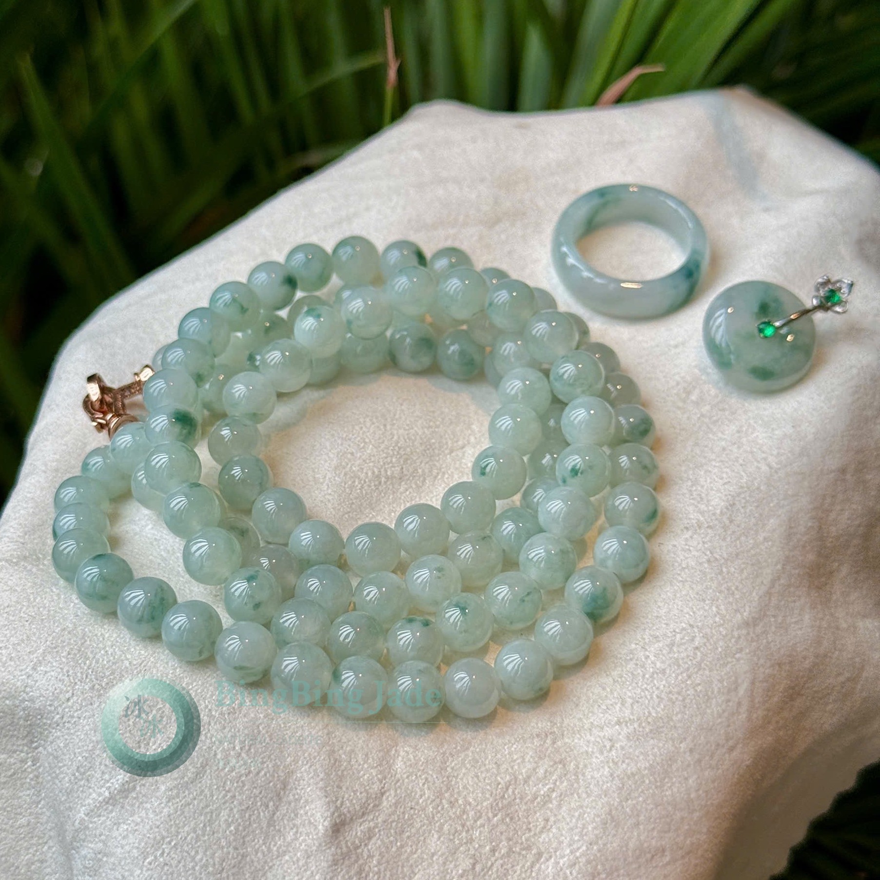 Floating Blossom Icy Jadeite Combo — Long Beaded Necklace, Ring & Donut Pendant