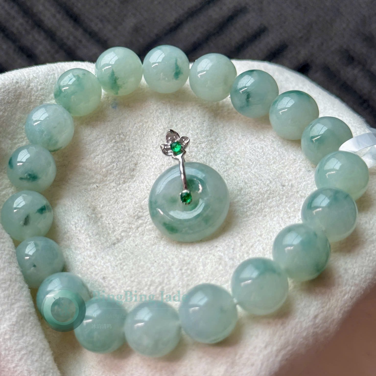 Floating Blossom Jadeite Bead Bracelet 10mm with Icy Donut Pendant Set