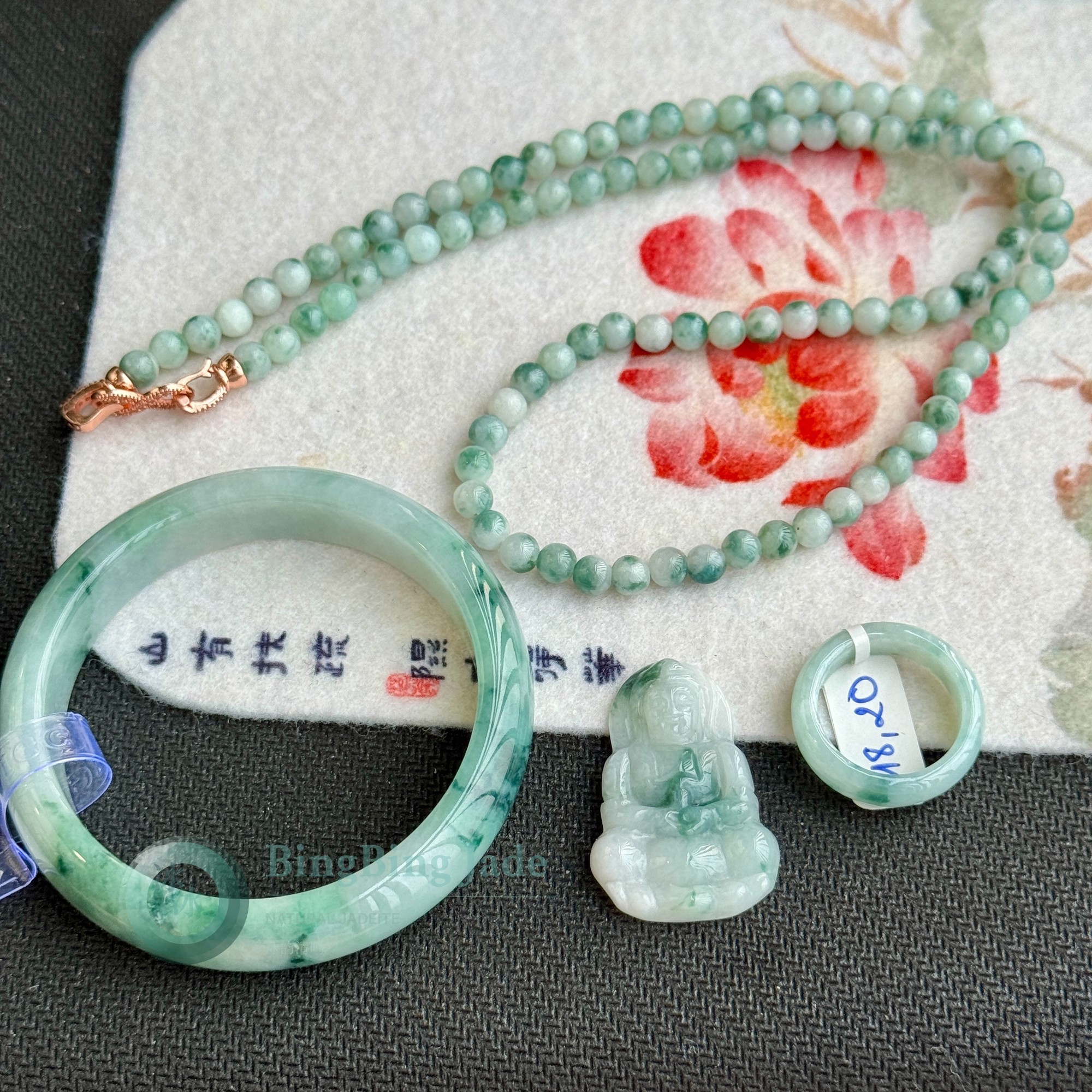 Floral Floating Green Jadeite Bangle 53.6mm — Complete Ensemble with Guanyin Pendant, Bead Necklace & Ring