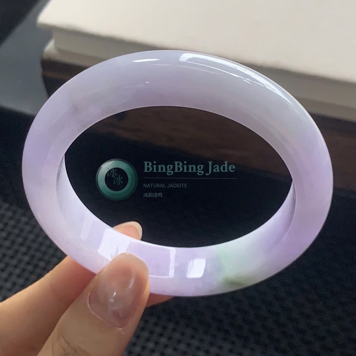 Lavender Mist with Floating Green Kiss — Jadeite Bangle 56.5mm
